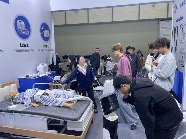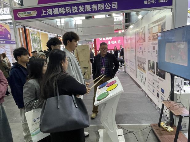 除了硬核的科技产品,各类养老机构带来的“创新养老服务”同样亮点纷呈。社区嵌入式养老服务中心的模拟场景里,日间照料、康复理疗、文化娱乐等服务一应俱全,工作人员介绍,这种模式能让老年人在家门口就能享受到专业养老服务;适老化健康产品展区则通过样板间,呈现了从家具布局到细节设计的适老巧思,比如防滑地板、可升降橱柜、紧急呼叫按钮等,让师生们深刻体会到“适老”不仅是功能满足,更是对老年人生活品质的关怀;