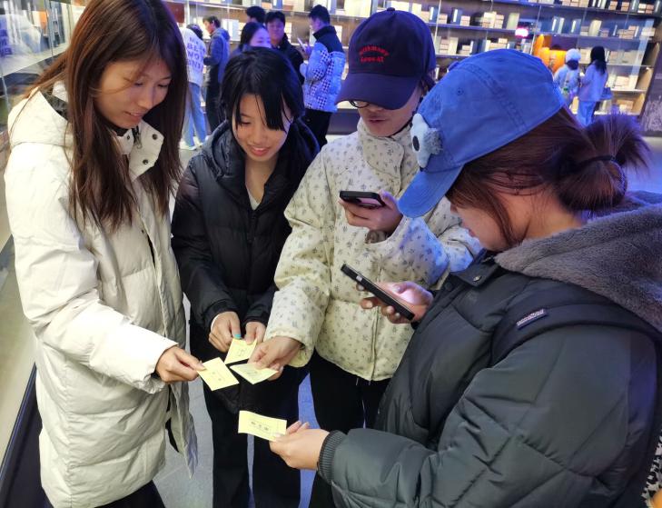 参观过程中的互动体验环节,极大地点燃了同学们的参与热情。其中,在“魁星点斗”互动区的抽签活动,更是将气氛推向了高潮。同学们纷纷踊跃参与,模拟古代士子“一朝登科”的戏剧性场景。一名同学幸运抽中“第一签”,在众人的欢呼与祝贺中,亲身演绎了古代士子金榜题名时的荣耀与喜悦。这一鲜活场景不仅让同学们感受到了科举文化的魅力,更为他们策划沉浸式节庆体验活动提供了生动的范本和灵感。