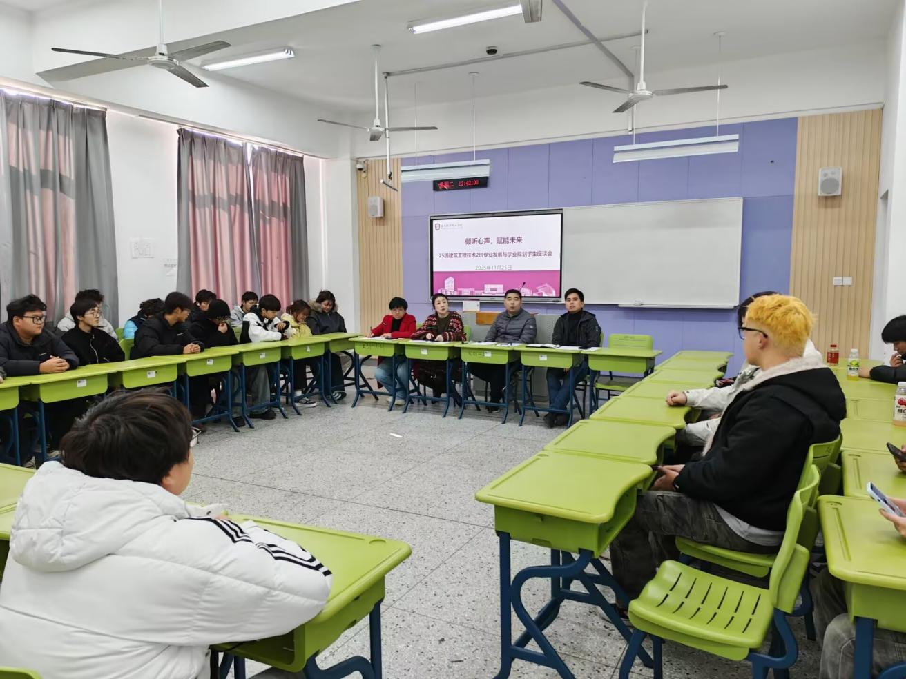 为深入了解学生需求,扎实推进学风建设,11月25日,康养工程学院组织召开了25级建筑工程技术2班学生座谈会。本次座谈会以“专业发展与学业规划”为主题,旨在搭建师生交流平台,帮助学生明确学习目标,增强专业认同感与发展信心。学院副书记副院长周康、建筑工程技术专业负责人于露、专业任课教师王珊珊出席座谈,学工办辅导员王林主持会议。