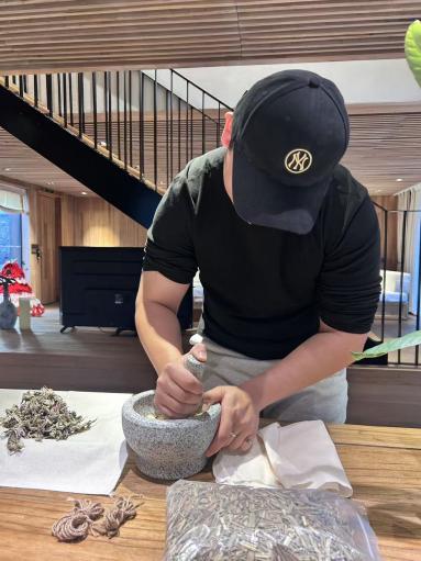 本次实践学习聚焦康养服务核心技能,设置裸叶水疗SPA、古法草药球制作及按摩、接待服务礼仪标准、瑜伽练习等核心模块。其中,裸叶水疗SPA学习中,学生们系统掌握融合洋甘菊、佛手柑与薰衣草香气的舒缓按摩技法,校外导师从精油调配、力度把控等维度教学,这与校内康养按摩技法课程的理论知识形成呼应;古法草药球按摩学习中,学生研习草药球选材配比、手工缝制及祛湿驱寒按摩手法,更是对中医养生课程内容的实操深化;接待服务礼仪实训则衔接了校内健康服务礼仪课程的规范要求;瑜伽练习模块也与专业中的运动健康管理课程知识点紧密结合,学生们在导师指导下,将所学的体式原理、呼吸调节等知识转化为实操能力。