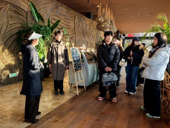 劳动实践结束后,在康乐部李承芬经理的带领下,师生们开启度假村全景参观学习。从错落分布的生态客房到配套完善的水疗中心、特色餐厅,从生机盎然的生态农场到充满野趣的休闲区域,以及度假村内的溧水生物多样性博物馆。裸心岭将自然生态与文旅康养服务深度融合的运营模式,让同学们开阔了视野、深受启发。参观过程中,李经理围绕度假村服务标准、升级规划,以及生态保护与文旅发展协同推进路径展开介绍。同学们结合专业所长积极互动提问:旅游管理专业聚焦服务流程优化与客户体验提升,建筑工程专业关注绿色建筑技术应用与低碳改造,智慧养老专业则探讨生态康养场景打造与适老化服务设计,实现了专业知识与真实文旅康养场景的深度碰撞、精准对接。
