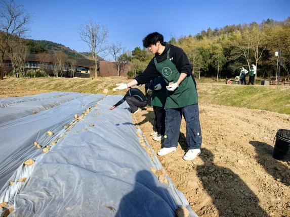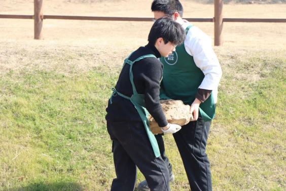 抵达裸心岭后,在度假村领导及工作人员的引导下,师生们开始助力度假村升级提质的劳动实践。本次劳动聚焦生态景观优化核心任务,涵盖翻土、捡碎石、撒肥播种、灌溉、铺地膜等实操环节,与校内劳动教育课程形成呼应,成功推动课堂理论知识向真实实践场景落地。同学们与度假村工作人员默契协作,有条不紊地推进各项任务。冬日的农场,师生们忙碌的身影与山野景致相映成趣,“劳动最光荣、劳动最崇高”的理念也在躬身实践中深深扎根。共同劳作中,度假村工作人员细致分享农业生产技巧与生态养护经验,助力同学们在掌握实操技能的基础上,深刻领悟裸心岭“生态优先、返璞归真”的发展内核。