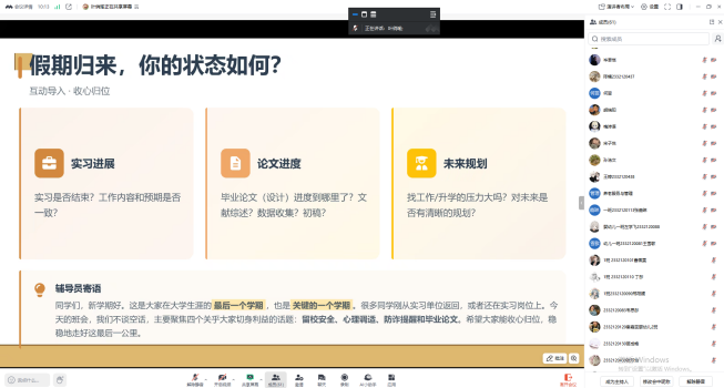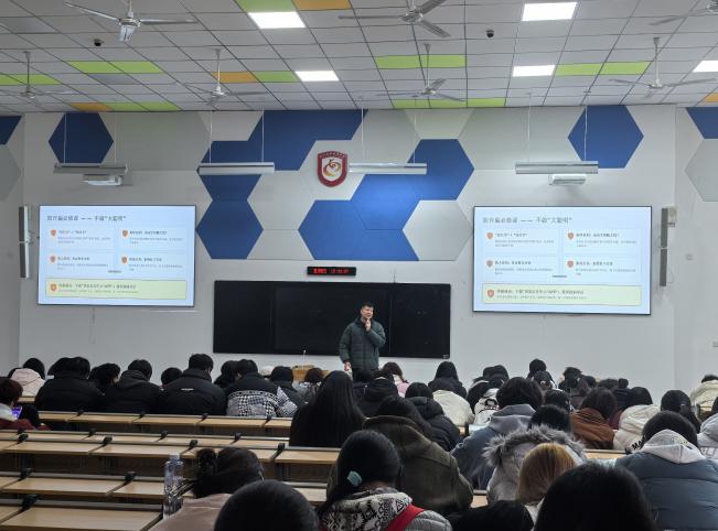班会上,各位辅导员、班主任老师围绕多个维度,与同学们进行了深入的交流与引导: (一)作为今年学院学生工作的重中之重,老师们重点强调了学风建设的重要意义。结合各专业特点和学生所处年级阶段,引导同学们科学制定新学期学业计划,明确学习目标,端正学习态度,激发内在学习动力。鼓励同学们在新学期里勤学善思,互帮互助,共同营造严谨、求实、进取的良好学习氛围,以优良学风促进个人成长成才。(二)针对春季学期学生可能面临的情绪波动和心理调适需求,老师们普及了心理健康知识,介绍了学校心理健康教育与咨询中心的资源与预约方式,鼓励同学们遇到困扰时积极寻求帮助,学会科学减压,保持乐观向上的心态,以强健的体魄和阳光的心态迎接新学期的挑战。(三)结合近期社会及高校发生的电信诈骗典型案例,老师们通过详实的数据和生动的讲解,再次敲响安全警钟。重点开展了防范电信网络诈骗专题教育,剖析常见诈骗手段和套路,提醒同学们时刻保持警惕,不轻信、不透露、不转账,切实守护好个人财产和信息安全。(四)重申了宿舍管理规定,强调了安全用电、防火防盗、保持内务整洁的重要性,引导同学们共同维护安全、文明、和谐的宿舍环境。除上述重点内容外,部分班级还结合实际情况,将文明礼仪教育、劳动教育、国防教育、资助政策宣讲等内容有机融入班会之中,力求内容丰富、形式多样,全方位满足学生成长发展需求。