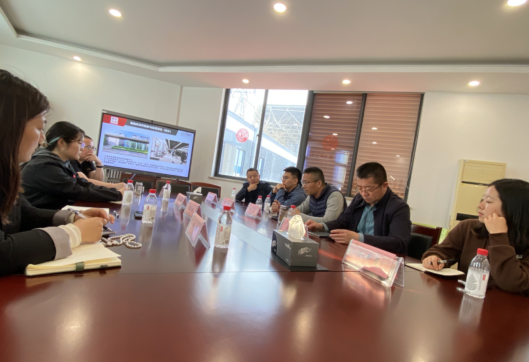 在参观结束后,双方举行了座谈交流。江苏敏驰体育科技有限公司总经理胡冠宇详细介绍了“运动促进健康”理念的发展背景、江苏省运动促进健康站点建设情况,以及公司在全国的业务布局与人才需求。吴良勤副院长介绍了我校康养工程学院的发展历程、专业设置与人才培养特色,重点围绕“运动促进健康”创新班建设、智慧化产教融合实践等方面提出了合作设想。双方就进一步深化校企协同育人、共建实训平台、推动课程与岗位对接等方面达成初步共识。