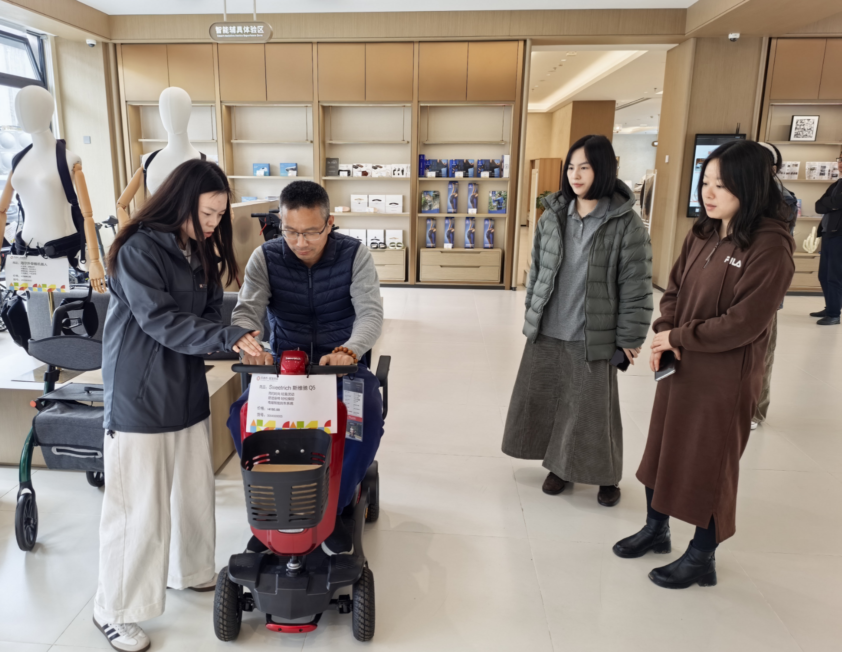 考察首站来到苏州康养集团旗下、苏州首家综合性银发经济载体——苏康养·银发商城。该商城于3月27日正式启用,是集产品展销、场景体验、康养服务、线上联动于一体的综合性银发经济平台。在商城总经理张雅倩的陪同下,学院一行实地参观了商城四层功能空间,深入了解智能辅具、适老科技、健康管理、银发生活服务等多个板块的运营模式与产品体系。通过沉浸式体验各类智能化适老产品,学院一行对当前银发产业的前沿技术、服务理念及场景应用有了更直观的认识,为学校正在推进的新街口校区17楼智慧康养产教融合实践中心建设提供了参考与启发。