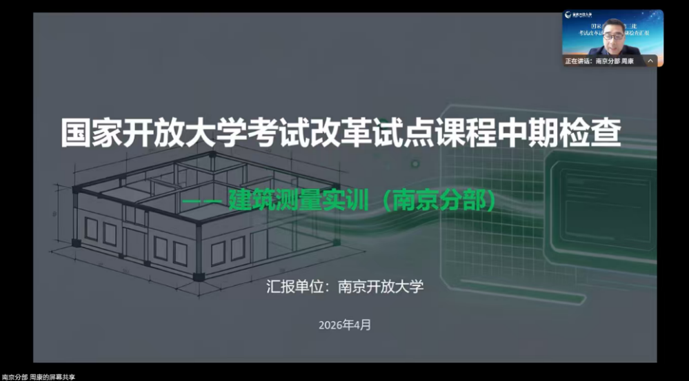 根据国家开放大学统一部署,4月24日上午,我校康养工程学院申报的“建筑测量实训”课程作为国开第三批考试改革试点项目,通过腾讯会议平台参加了线上中期汇报及交流研讨。课程负责人周康向总部专家组详细汇报了课程考试改革推进情况。